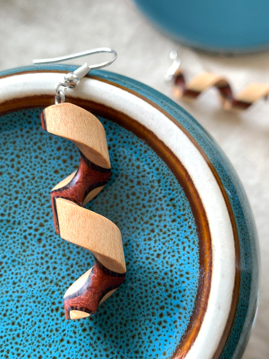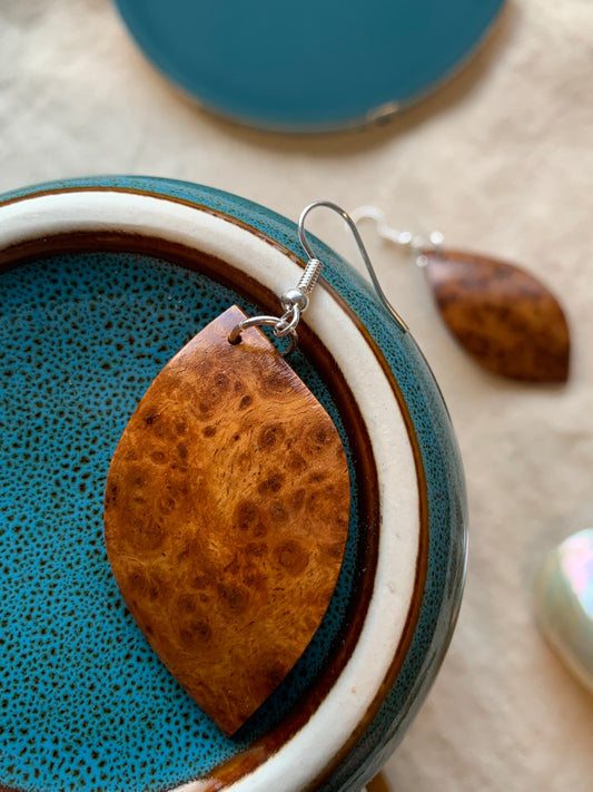 Amboyna Burl, Curved Leaf Wooden Earrings