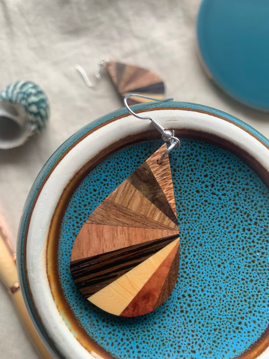 "Ray of Nature Earrings – Multicolor Wood Teardrop with Ray-like Pattern | Sjarel Handmade Jewellery"
