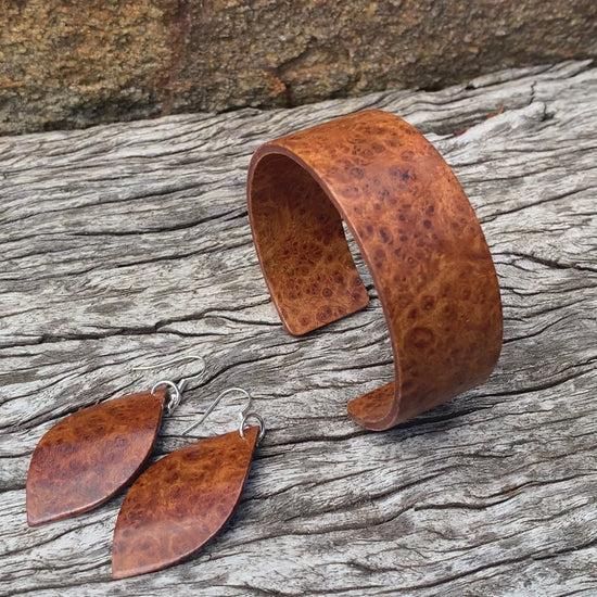 Introducing the Amboyna Burl Set: a stunning combination of a wooden bangle and matching leaf earrings, crafted from premium Amboyna Burl wood. This unique set showcases the natural beauty and intricate grain patterns of Amboyna Burl, making each piece a one-of-a-kind accessory. The bangle, created using the bentwood technique, offers both strength and flexibility, while the matching leaf earrings add an elegant, organic touch to the ensemble. Perfect for those who appreciate fine craftsmanship and the timeless allure of natural wood, the Amboyna Burl Wooden Bangle and Leaf Earrings set is a true testament to nature's artistry and the skillful hands that shaped it.