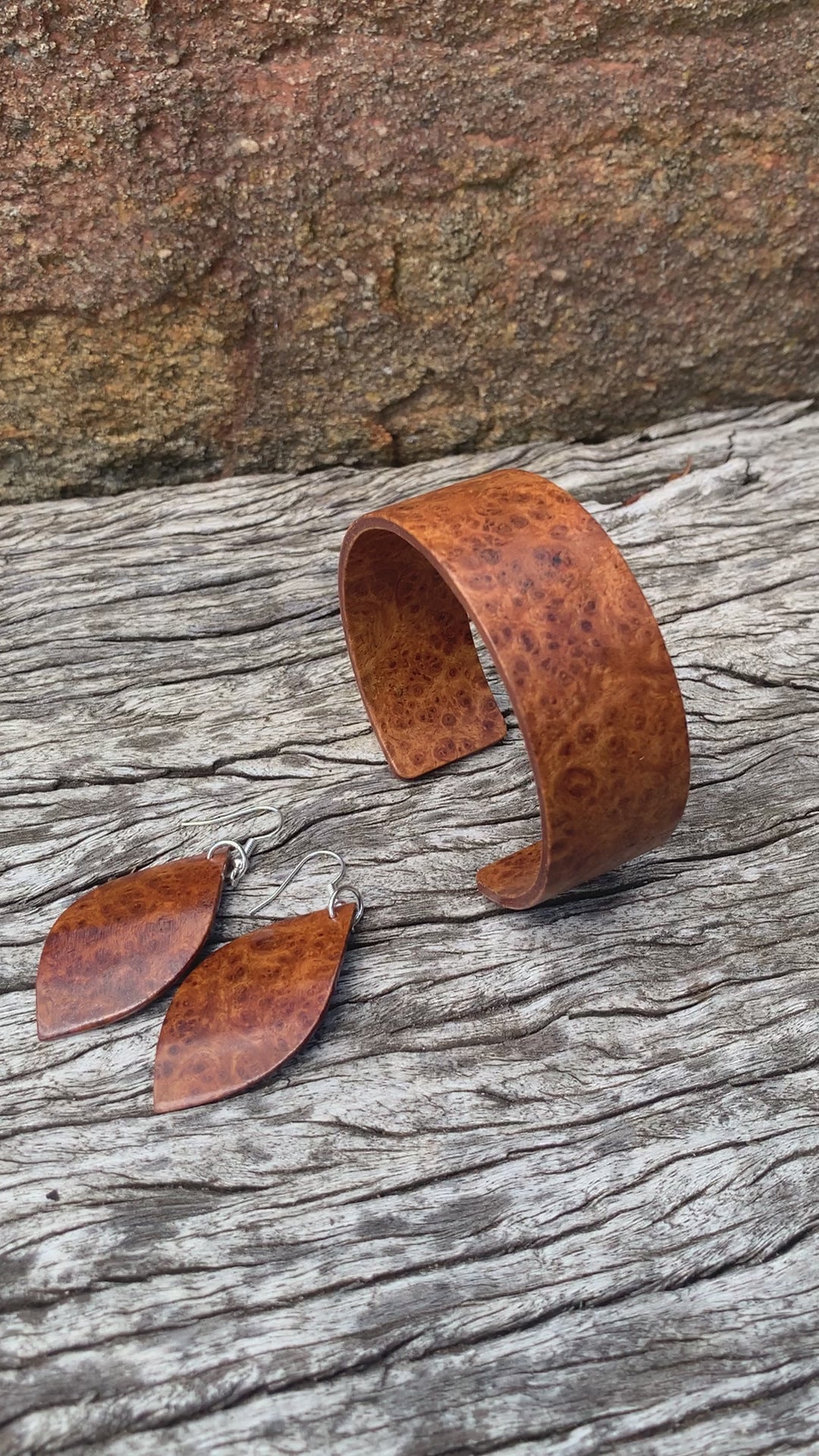 Amboyna Burl Set Wooden Bangle and Leaf Earrings